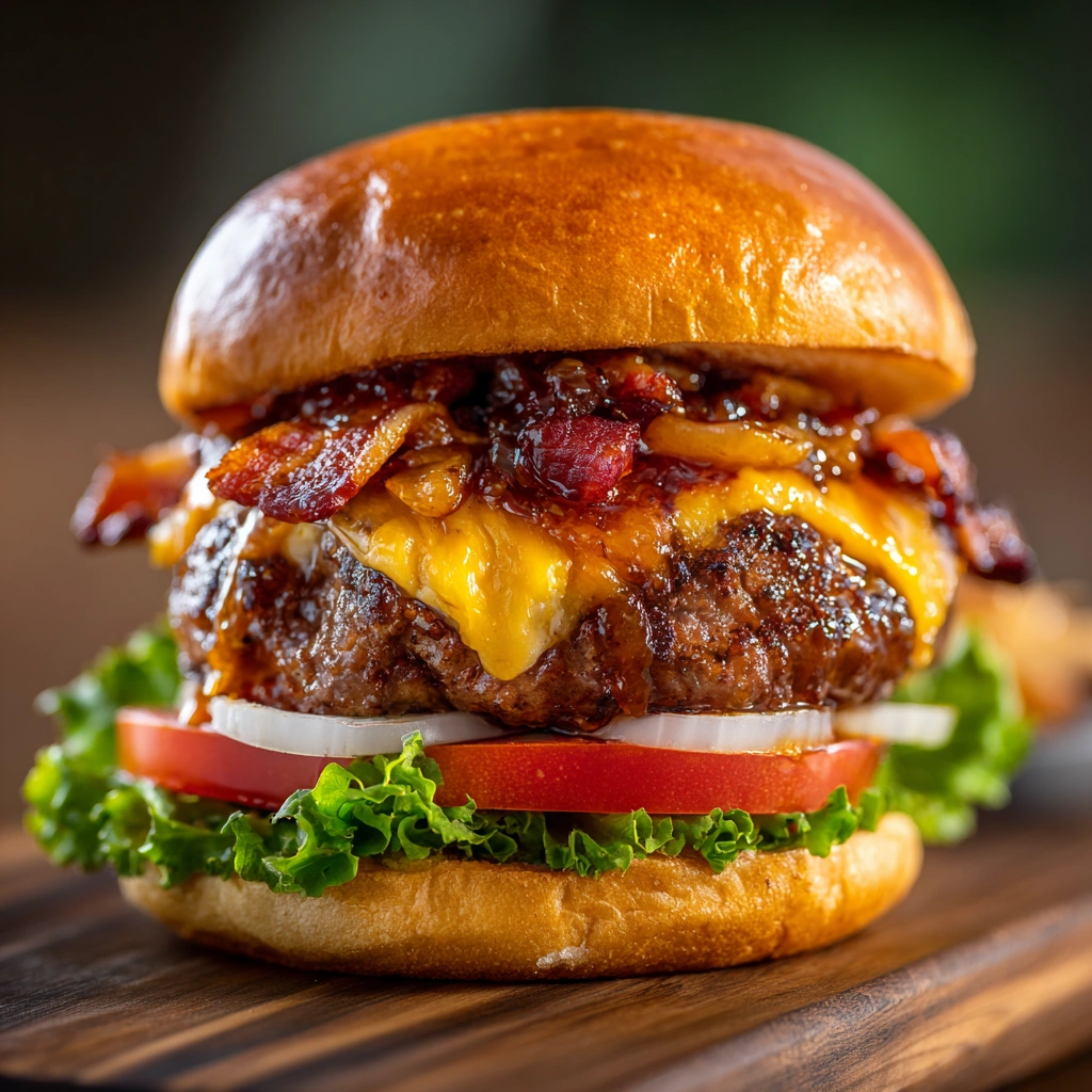 Juicy beef patties topped with smoky bacon, sweet beer‑caramelized …