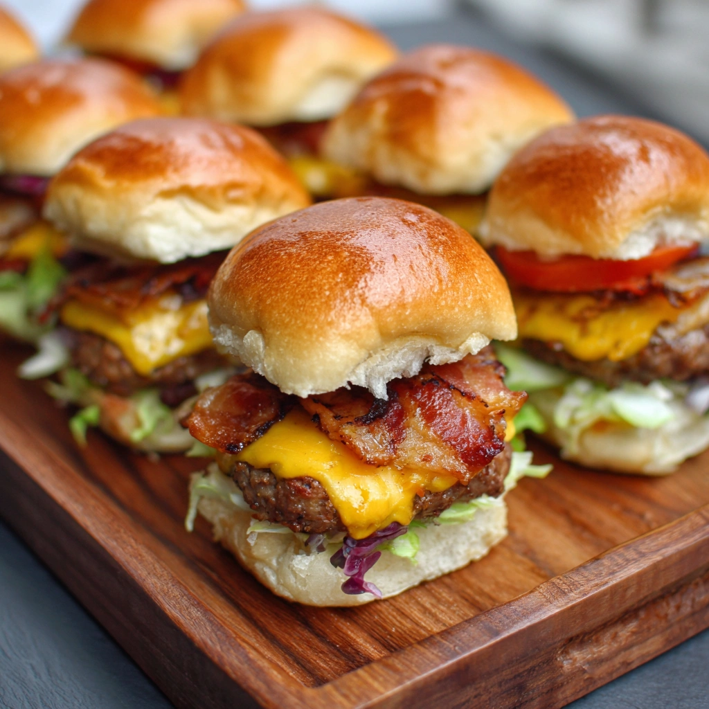 Mini burgers on soft slider buns — loaded with beef, crispy bacon, cheese, and perfect for parties, snacks, or a casual dinner.