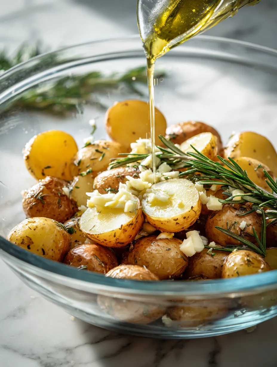 Peel the potatoes (optional for extra texture), trim the rounded ends slightly, and slice into 1-inch-thick rounds. Add the potatoes and chopped rosemary to the butter mixture, tossing until evenly coated.