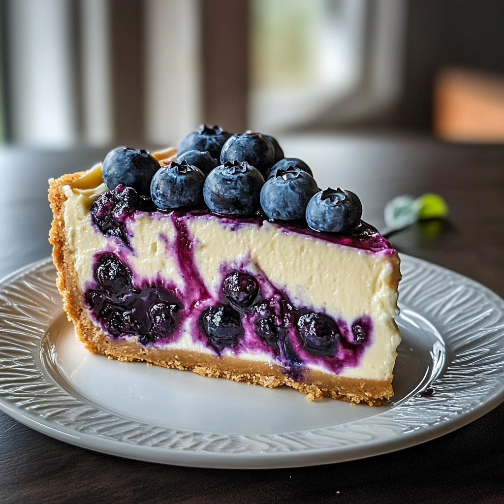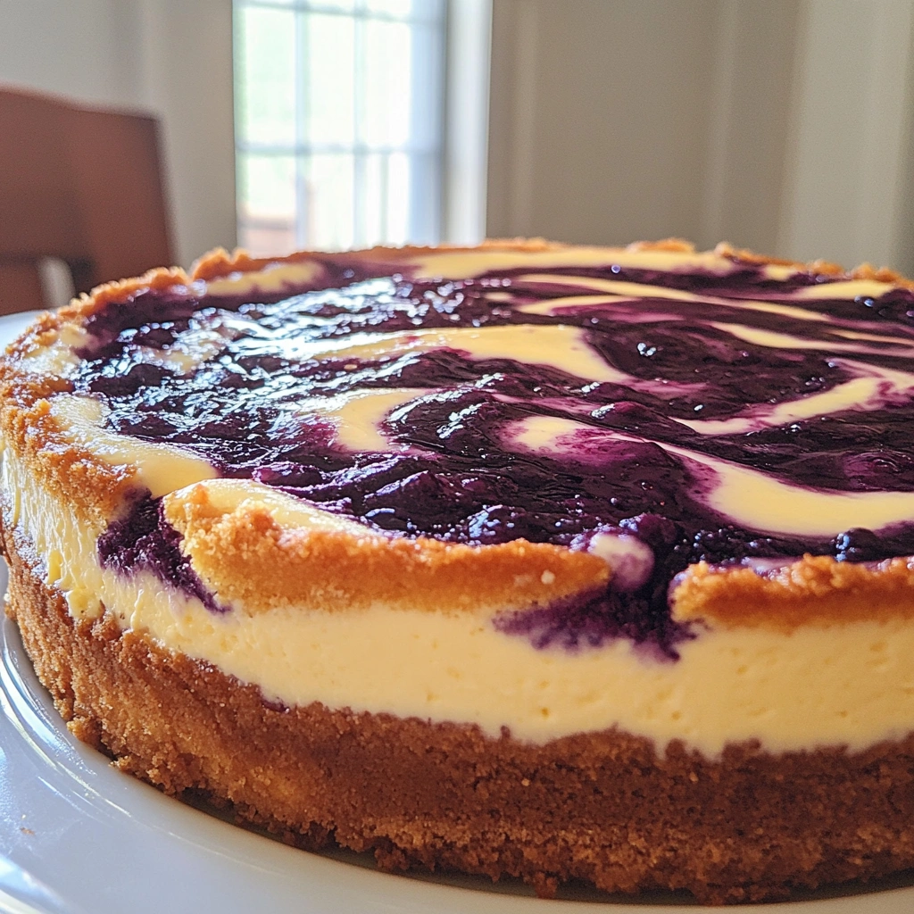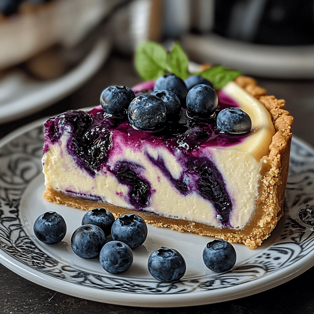 Blueberry Swirl Cheesecake combines smooth cream cheese filling with swirls of sweet blueberry sauce atop a buttery graham cracker crust. This delightful dessert offers both richness from the cheesecake and brightness from fresh blueberries, making it an irresistible treat suitable for any occasion.