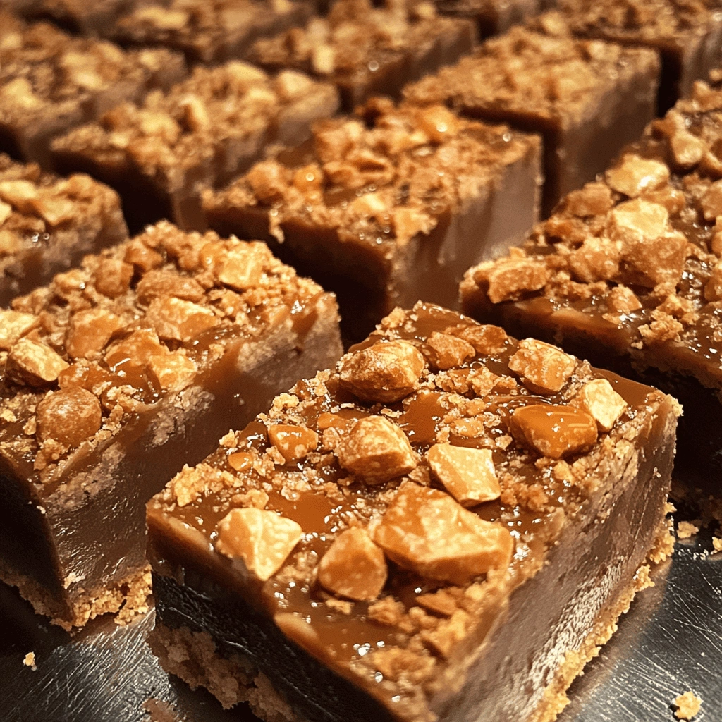 To achieve the best Butterfinger Caramel Crunch Bars, consider using high-quality chocolate for coating. A good chocolate enhances flavor and provides a satisfying snap when you bite into it. Melting chocolate can be tricky; use a double boiler or microwave in short bursts to prevent burning. Stir gently until smooth for optimal results. Another tip is to line your baking pan with parchment paper before adding the mixture. This ensures easy removal and clean cutting later on. Finally, feel free to experiment with additional toppings like crushed nuts or drizzled chocolate for extra flair.