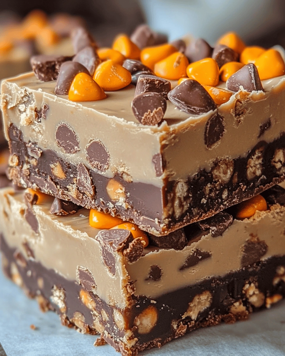 • Line an 8×8 inch pan with parchment paper, leaving some overhang for easy removal. In a microwave-safe bowl, combine the chocolate chips and sweetened condensed milk. Microwave in 30-second intervals, stirring after each, until melted and smooth. Fold in the chopped Butterfinger pieces and mini Reese’s Pieces. Spread the mixture evenly into the prepared pan. Set aside.