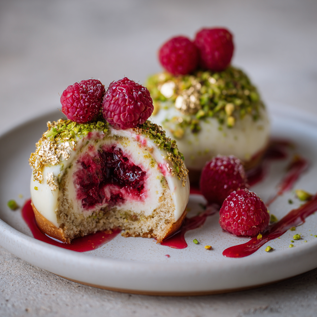 These elegant Pistachio & Raspberry Cheesecake Domes combine lush …