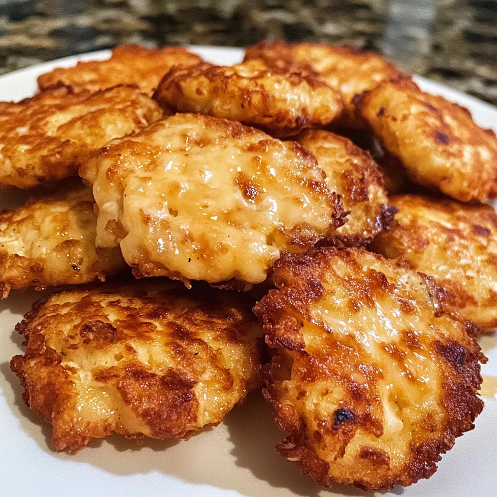 Cheesy Chicken Fritters are delicious savory bites made from shredded or ground chicken mixed with cheese and various seasonings, then fried until golden brown. They are perfect as appetizers or snacks and often served with dips or sauces.