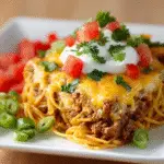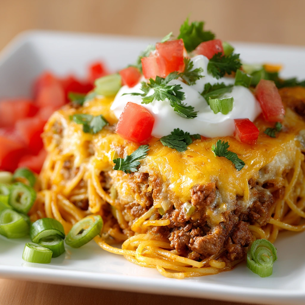A hearty, comforting bake that combines the flavors of tacos — spicy, savory, cheesy — with spaghetti pasta. This one-dish meal is great for feeding a family, meal-prep nights, or whenever you want the ease of pasta with bold taco-style flavors.