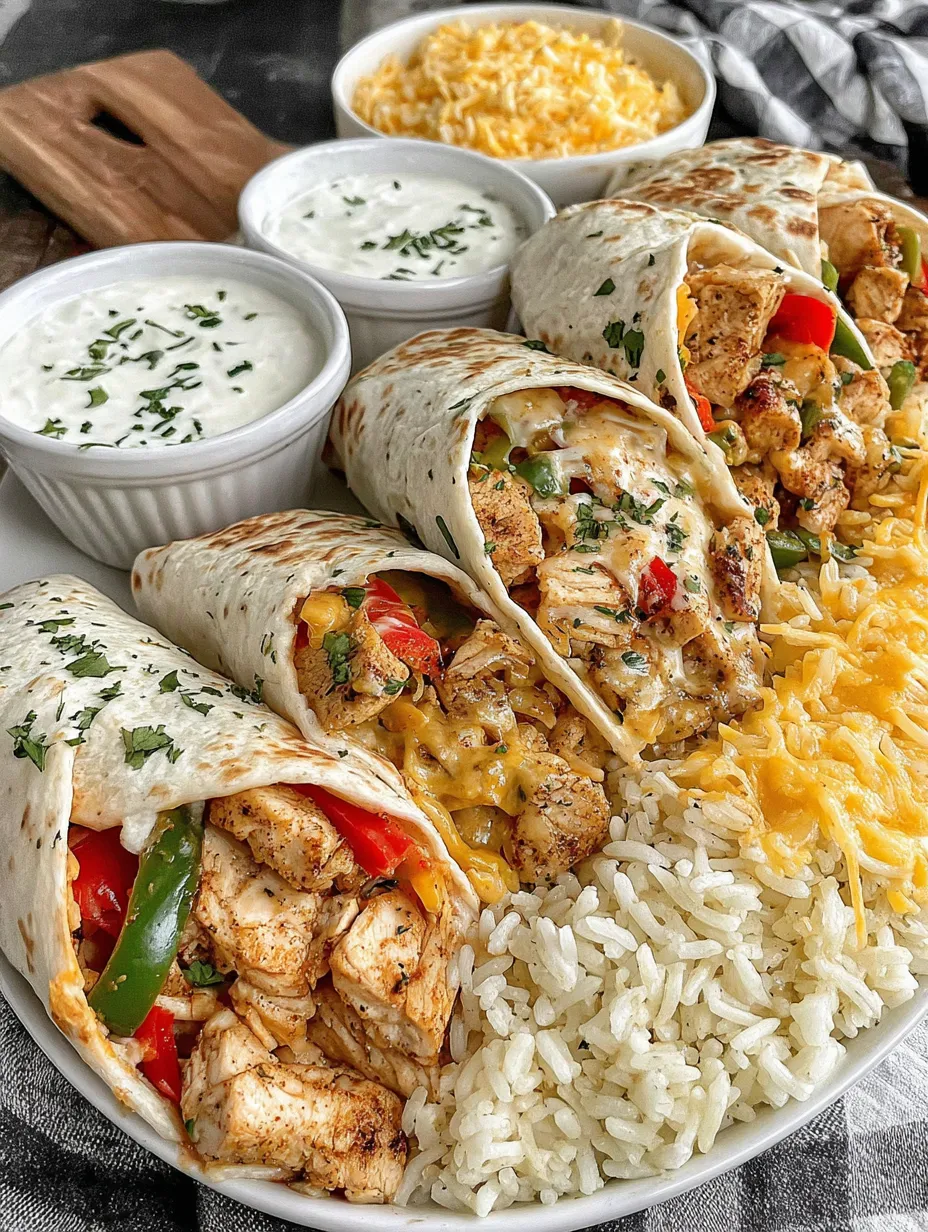 These Chicken Bell Pepper Burritos are the ultimate weeknight winner—juicy, seasoned chicken strips combined with tender sautéed red and green bell peppers, all wrapped in warm, soft flour tortillas. Fluffy rice, creamy ranch dressing, and melted cheddar cheese round out every bite, while a quick skillet toast gives the burrito a golden, slightly crisp exterior. Perfect for lunch, dinner, or meal prep, these burritos balance smoky spices, fresh vegetables, and creamy elements for a dish that satisfies both flavor and comfort cravings.