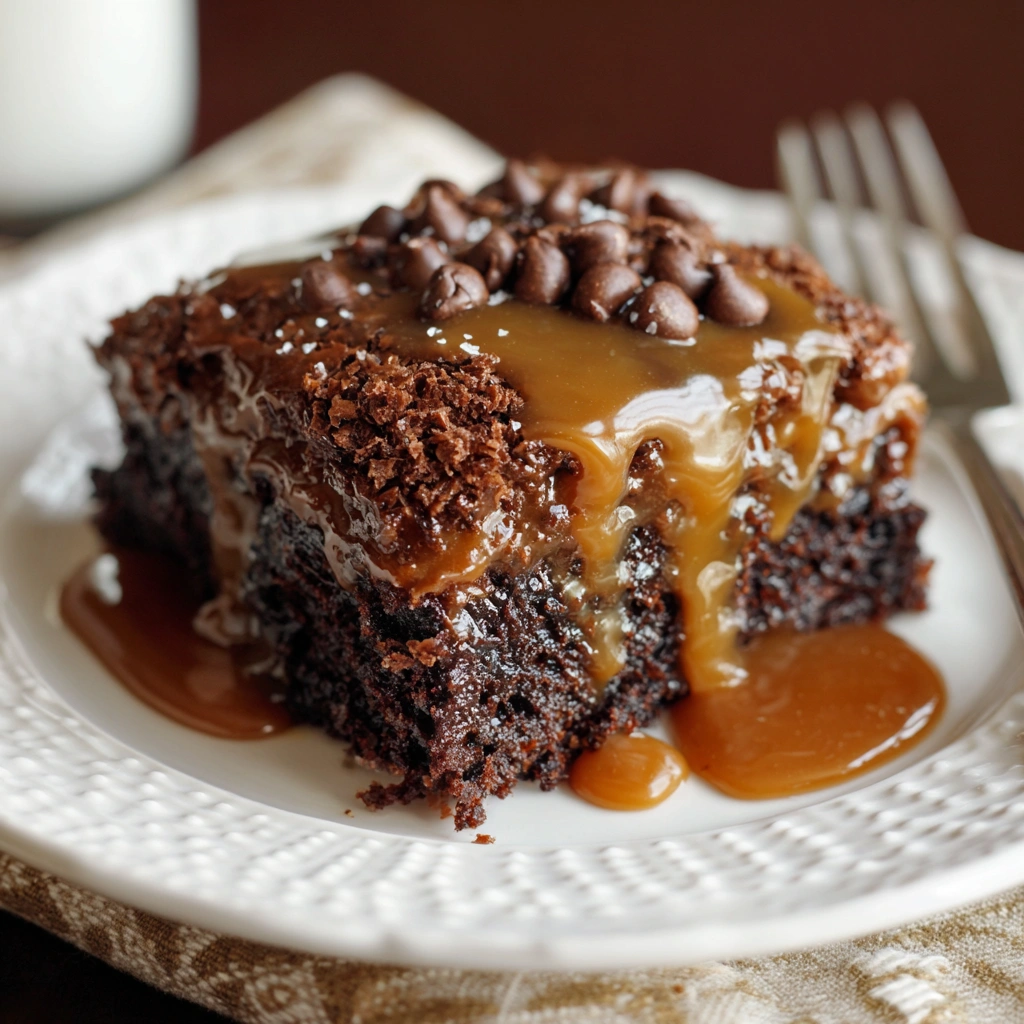 PrintChocolate Caramel Dump Cake – Gooey, Rich & Effortless