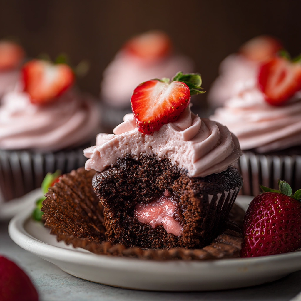 A decadent, chocolatey cupcake filled (or topped) with sweet strawberry jam — rich cocoa flavor meets fruity sweetness for a treat that feels indulgent and fun.