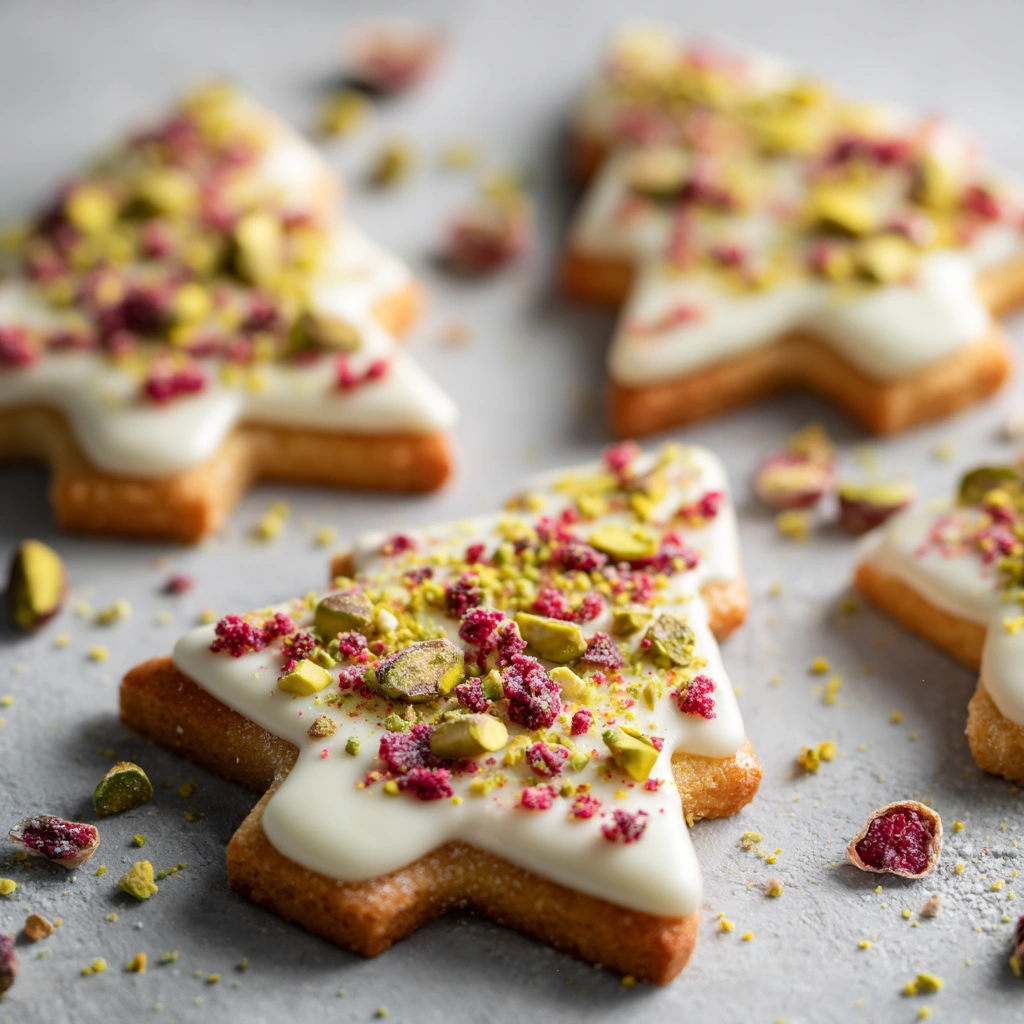 Chocolate-dipped trees: Dip half (or base) of each cooled cookie in melted chocolate or white chocolate; allow to set. Optionally sprinkle crushed nuts or crushed freeze-dried berries on the wet chocolate for festive color and crunch.