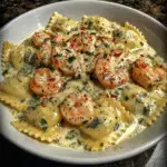 Plump ravioli filled with cheese or store-bought, bathed in a silky, creamy Parmesan sauce and studded with tender, garlicky shrimp — this dish is rich yet comforting, restaurant-style but easy enough for a weeknight dinner.
