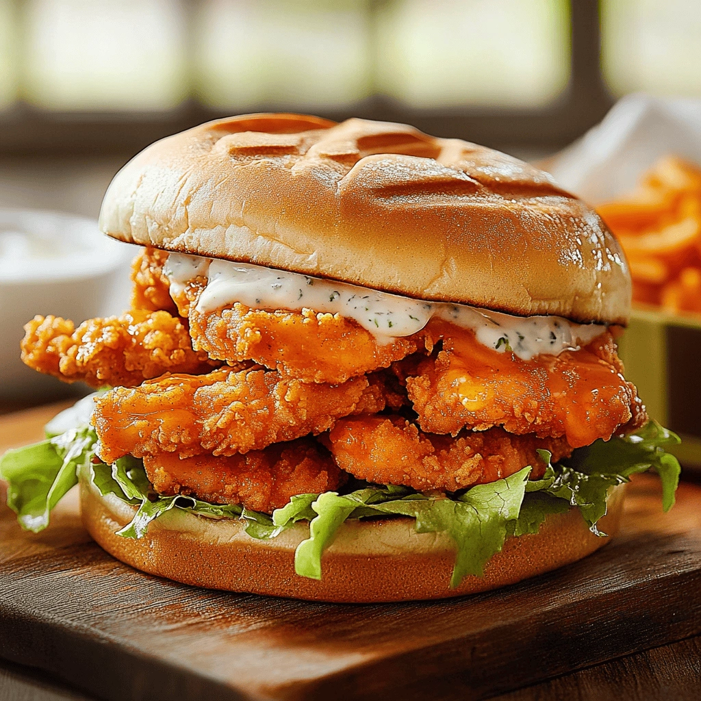 Lastly, assemble your sandwich immediately after frying while everything is hot and fresh. Layer crispy chicken on toasted buns with lettuce, tomato, pickles, and generous amounts of buffalo sauce to create a mouthwatering contrast of textures and flavors.