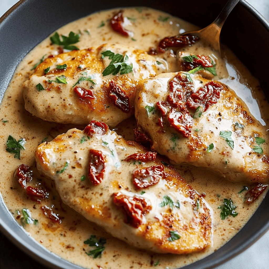 Drizzle generously warm sun-dried tomato cream sauce directly atop each piece ensuring full coverage while letting some flow down sides creating visually appealing presentation! Consider garnishing plates using freshly chopped parsley or basil sprigs adding vibrant color contrast enhancing overall appeal visually too!