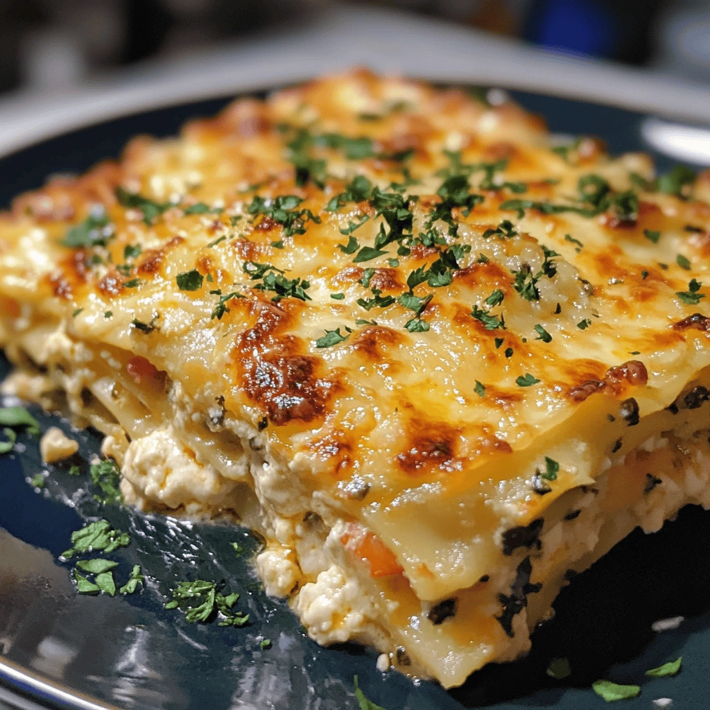Once baked, remove from the oven and allow your seafood lasagna to rest for about 10-15 minutes before slicing into portions. This resting time lets everything set properly so each slice maintains its shape when served.