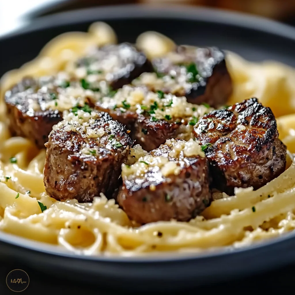 Indulge in this savory dish featuring tender garlic butter steak bites served over a bed of creamy parmesan pasta. Perfect for a weeknight dinner or a special occasion!