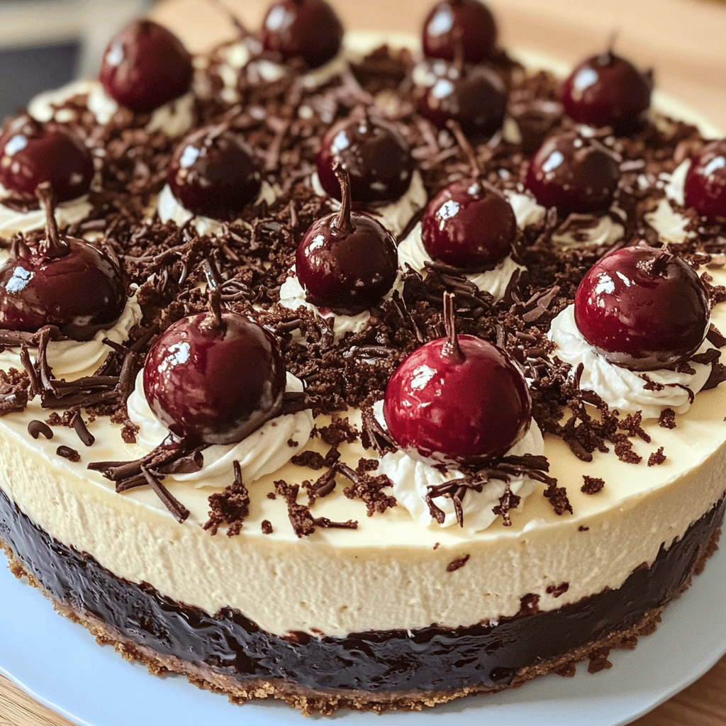 To enhance your Black Forest Cheesecake: A Decadent Dessert Delight, experiment with different toppings beyond traditional whipped cream. Drizzle chocolate ganache over the top for added richness or sprinkle shaved chocolate for visual appeal. Consider serving with a side of cherry sauce to complement the flavors beautifully; this adds moisture and enhances tartness. For a fun twist, try swirling raspberry puree into the cheesecake mix before baking for an unexpected burst of flavor. Remember that garnishing with whole cherries also makes for an attractive presentation.