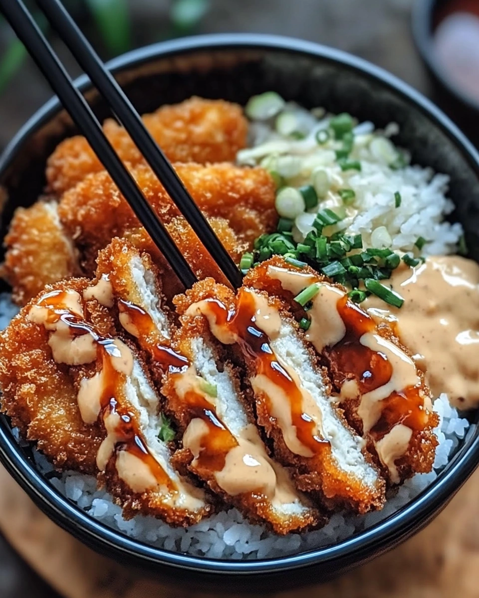 - Slice the crispy katsu into strips and arrange on top of the rice.