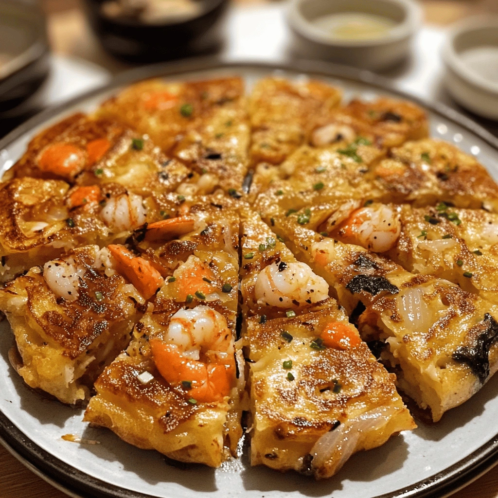 Korean Seafood Pancake (Haemul Pajeon) is a savory dish made from a batter mixed with various seafood and vegetables, typically pan-fried until crispy. It is popular as an appetizer or snack in Korea, often enjoyed with a soy-based dipping sauce.