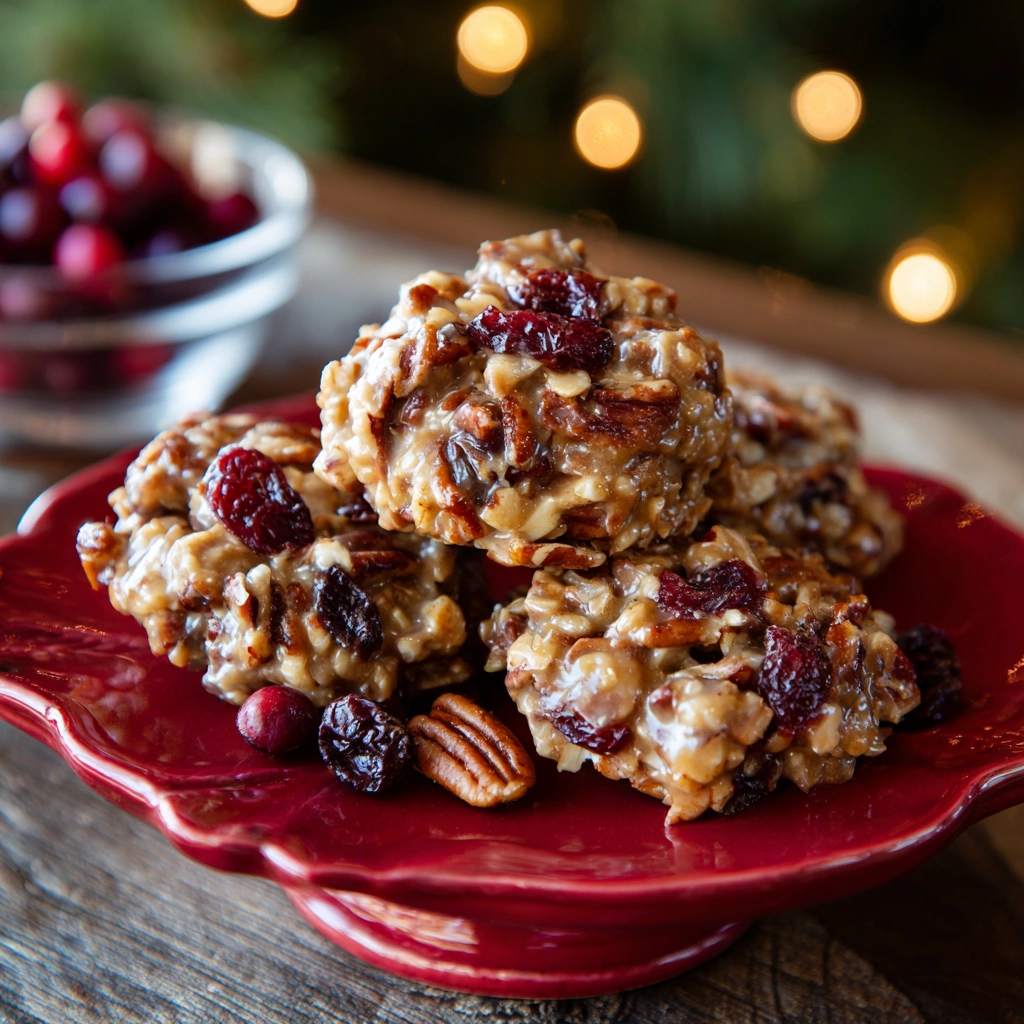 - Keywords: no bake cookies, praline cookies, cranberry pecan cookies, holiday no bake