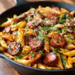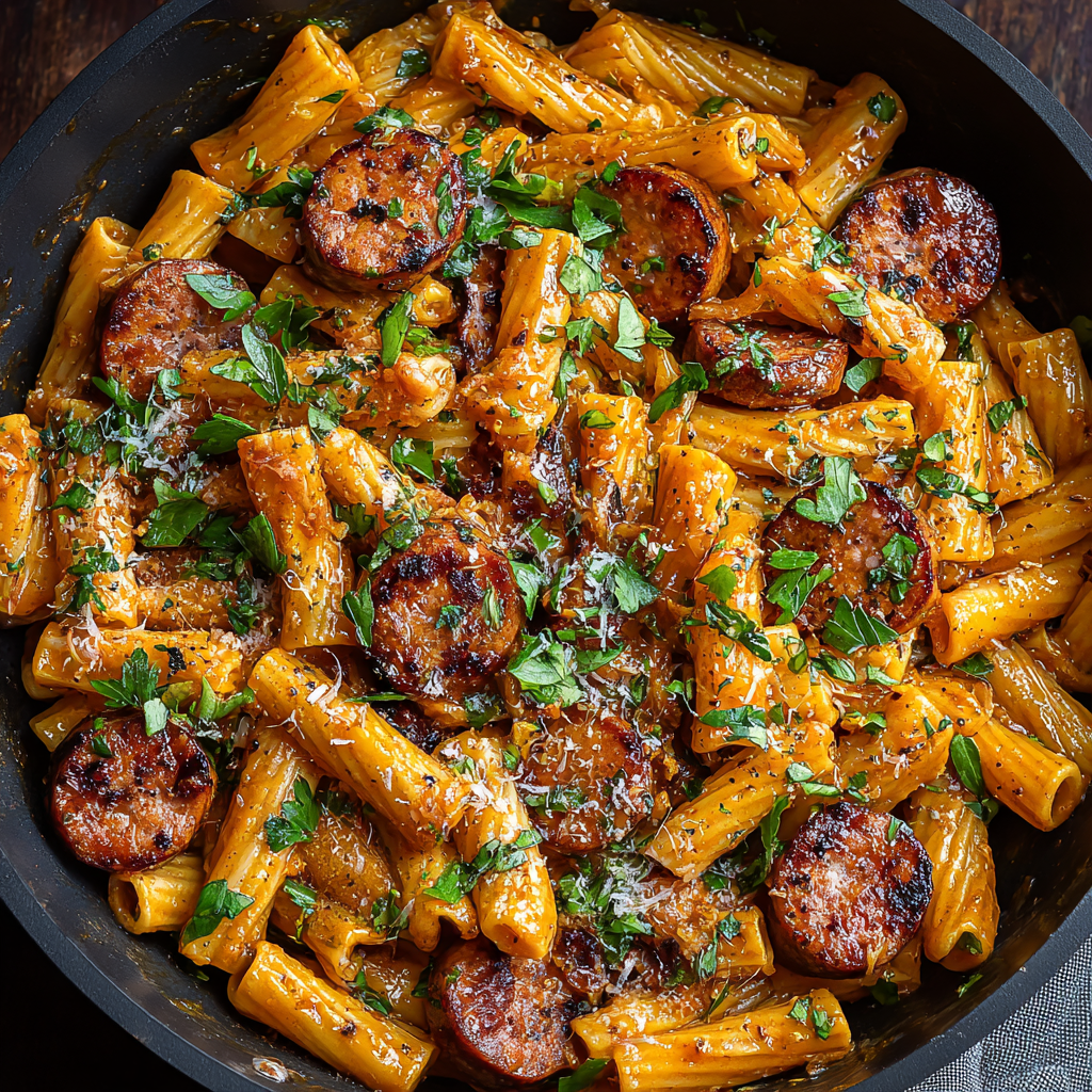 PrintOne-Skillet Spicy Honey BBQ Sausage Pasta – Sweet, Smoky & Zesty