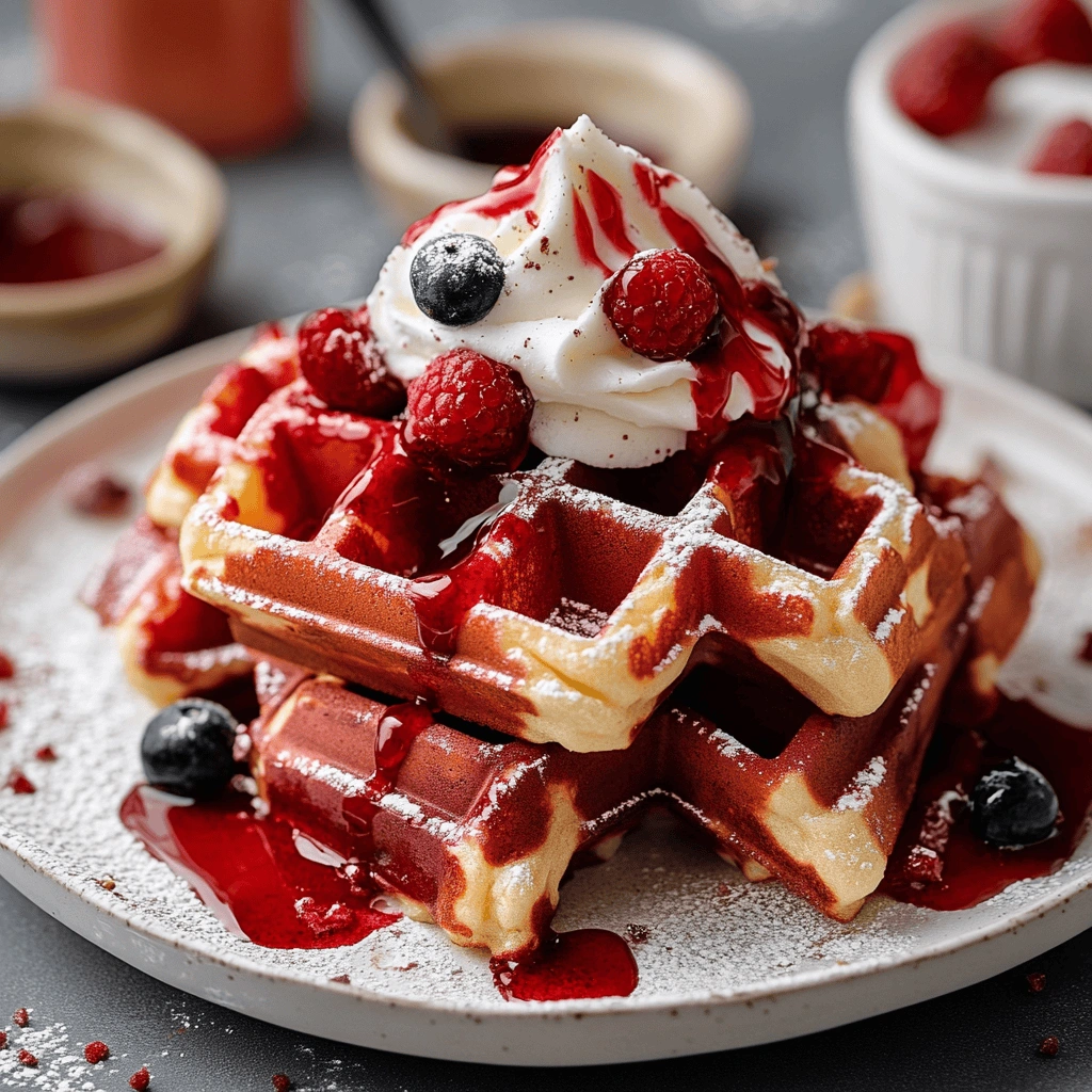 RED VELVET MARBLE WAFFLES are a delightful breakfast dish inspired by classic red velvet cake. They feature a rich cocoa flavor combined with red food coloring, creating an eye-catching marble effect when cooked in a waffle iron.