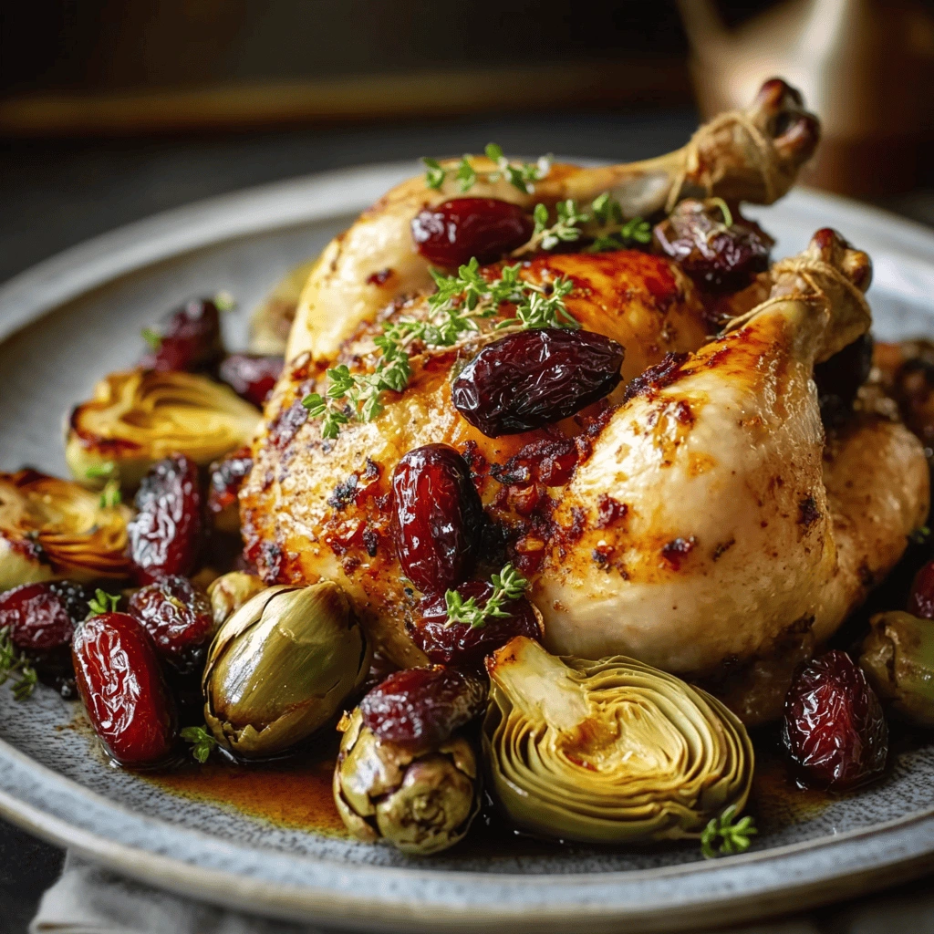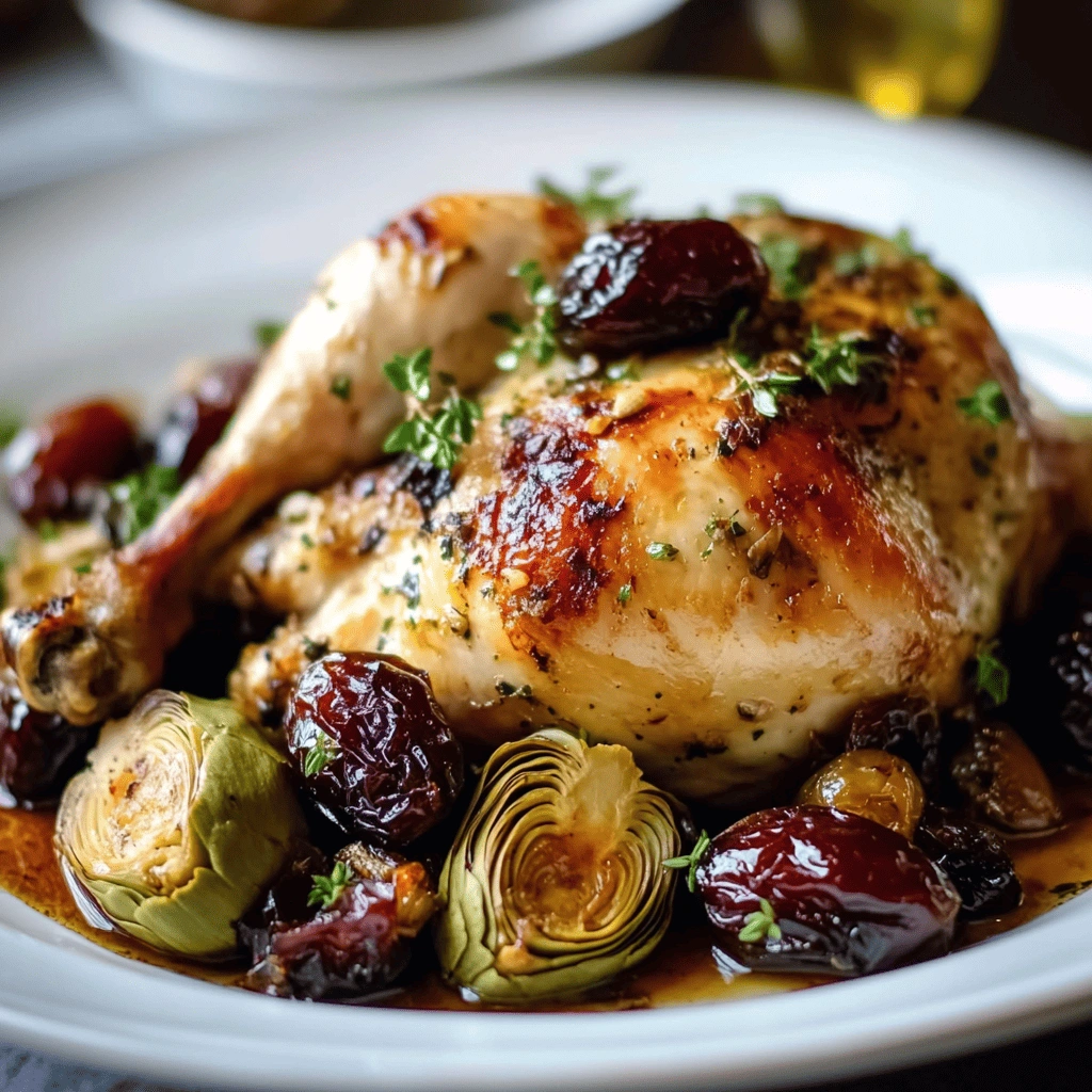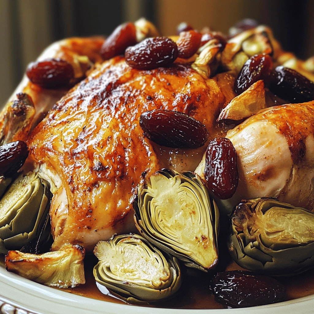 Cooking times can vary based on the size of your chicken, so be sure to check doneness regularly. Don’t forget to baste your chicken occasionally during roasting; this keeps the skin moist and flavorful while adding richness from the drippings. Finally, serve your roast chicken with dates and artichokes alongside a light salad or roasted vegetables for a balanced meal.