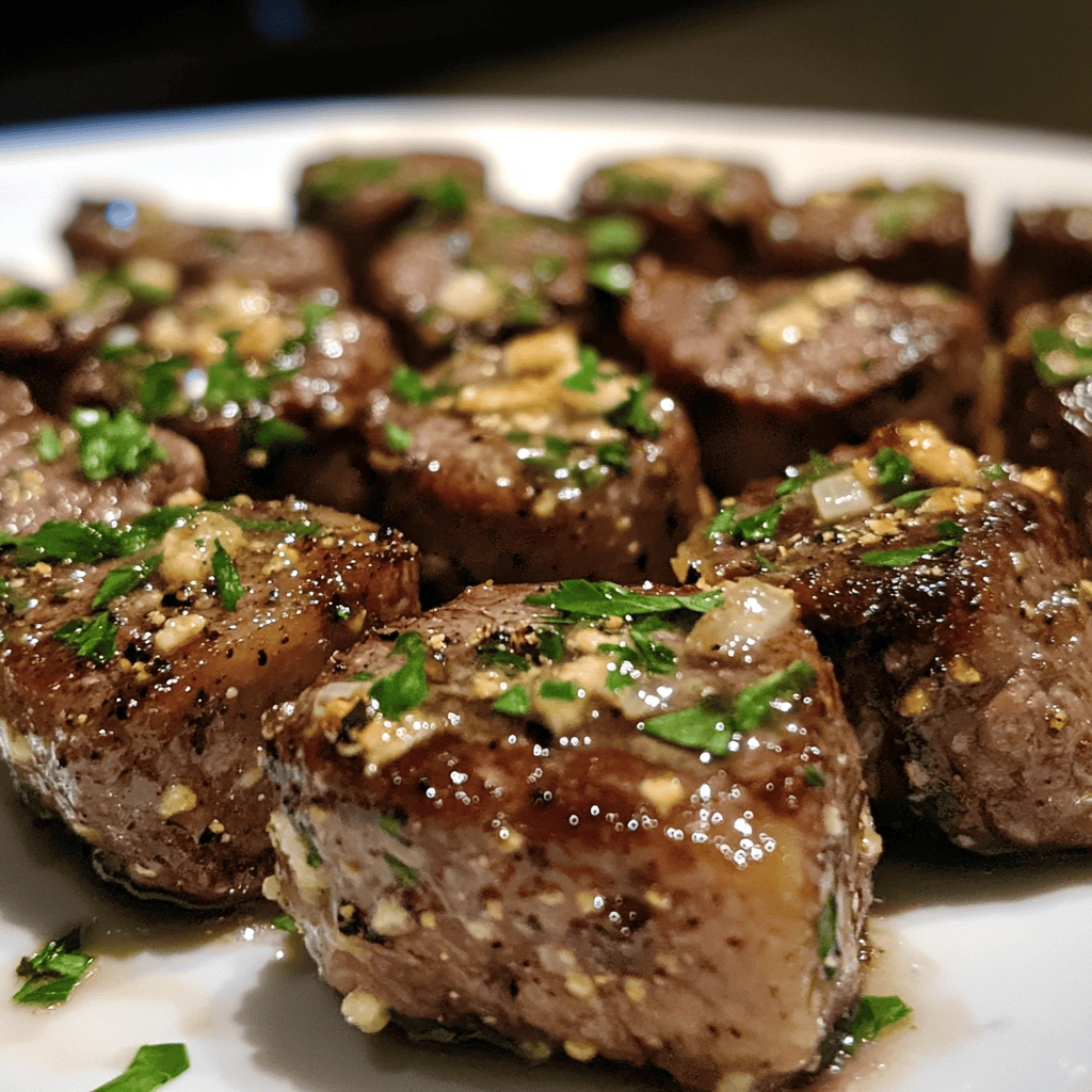 To serve these irresistible garlic butter steak bites beautifully arranged on a platter or individual plates! Consider garnishing them with freshly chopped parsley or additional minced garlic if desired—it adds color contrast while enhancing visual appeal too! Pair these delightful morsels alongside roasted vegetables or mashed potatoes as side dishes if desired—they complement nicely!