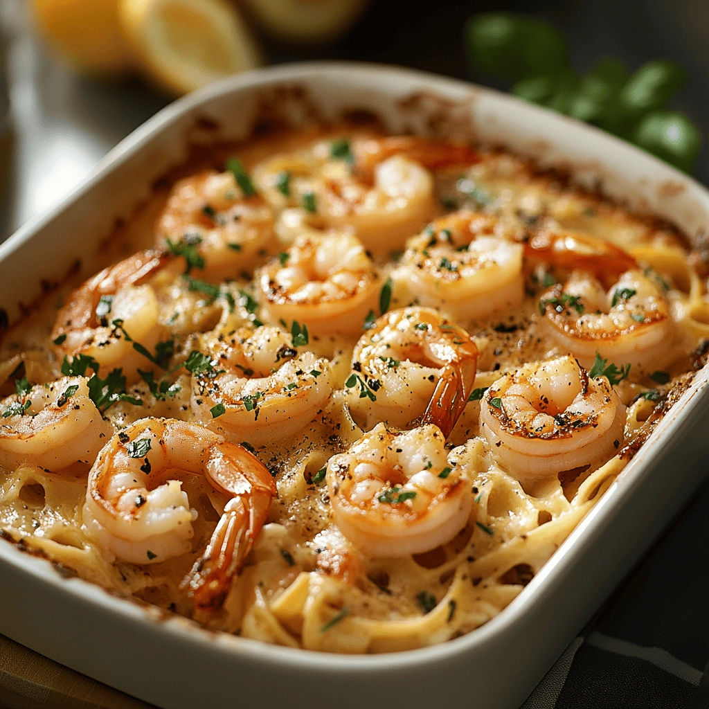 Shrimp Scampi Pasta Bake is a flavorful casserole featuring cooked pasta combined with sautéed shrimp in a garlic butter sauce topped with cheese and baked until bubbly. It blends delicious seafood flavors with comforting pasta for an appealing dish suitable for any occasion.