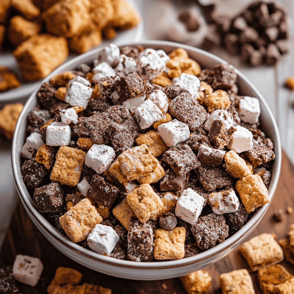 S’Mores Puppy Chow is a delightful snack made from Chex cereal mixed with melted chocolate and peanut butter, then coated in powdered sugar and combined with mini marshmallows and graham cracker crumbs. It offers all the flavors of traditional s’mores in a fun snack form that’s easy to enjoy anytime.