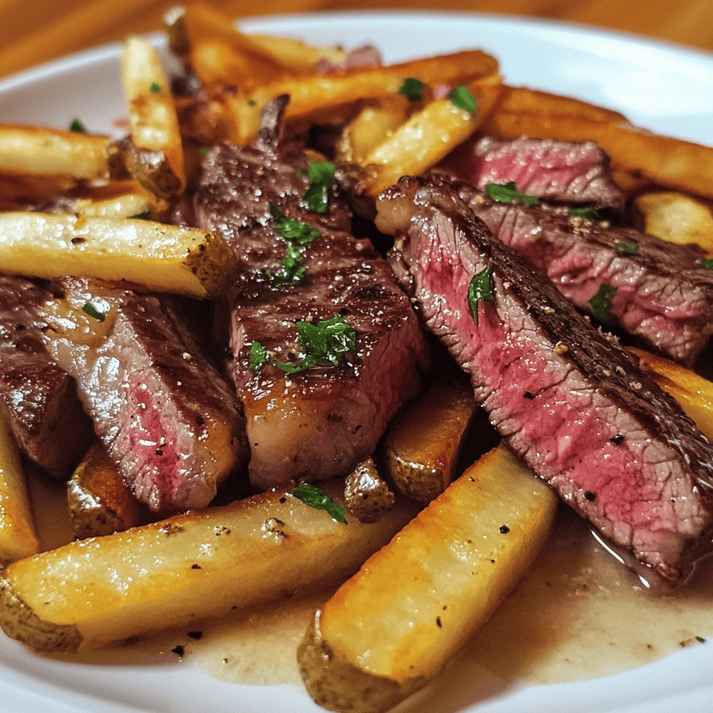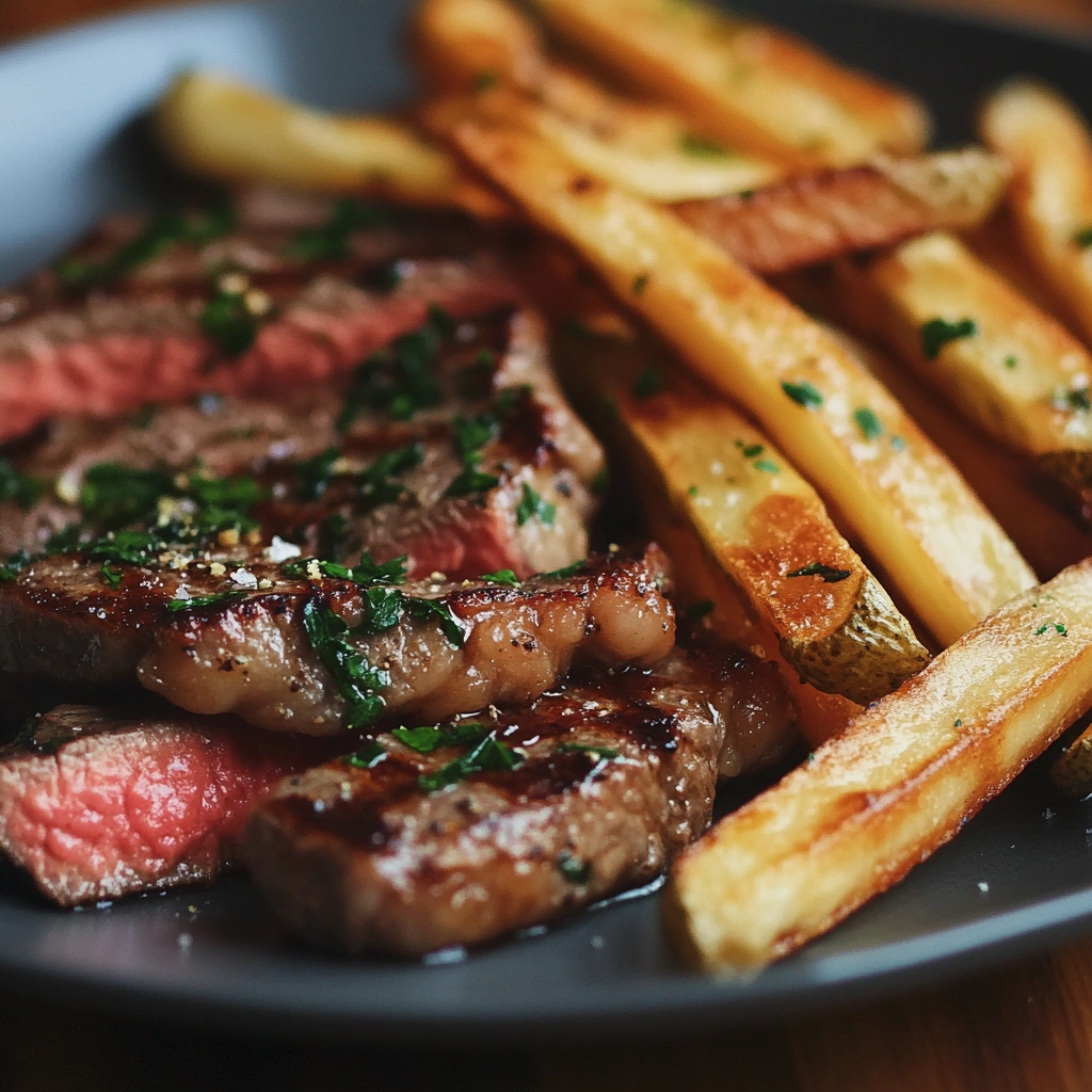 Slice rested steaks against grain into strips for serving alongside crispy fries. You can garnish with additional herbs if desired or serve with sauces like aioli or Béarnaise sauce for an authentic touch that pairs perfectly!