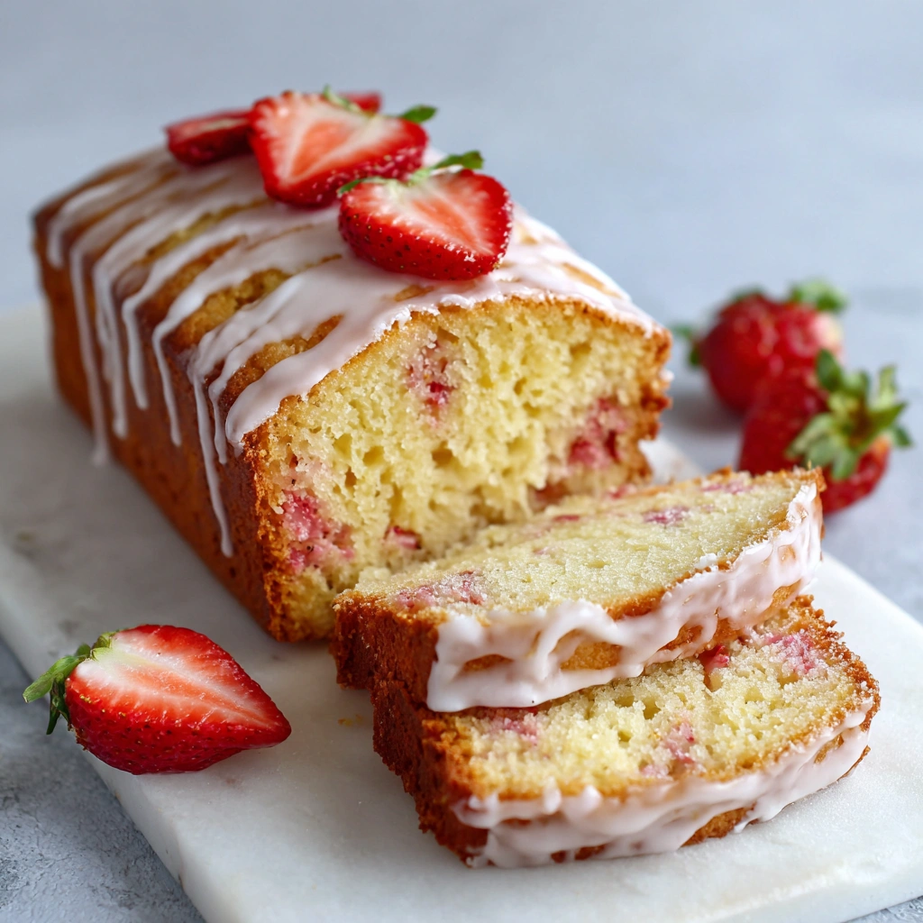 - If using glaze: whisk powdered sugar with milk or lemon juice until smooth and drizzle over cooled cake. Decorate with strawberry slices.