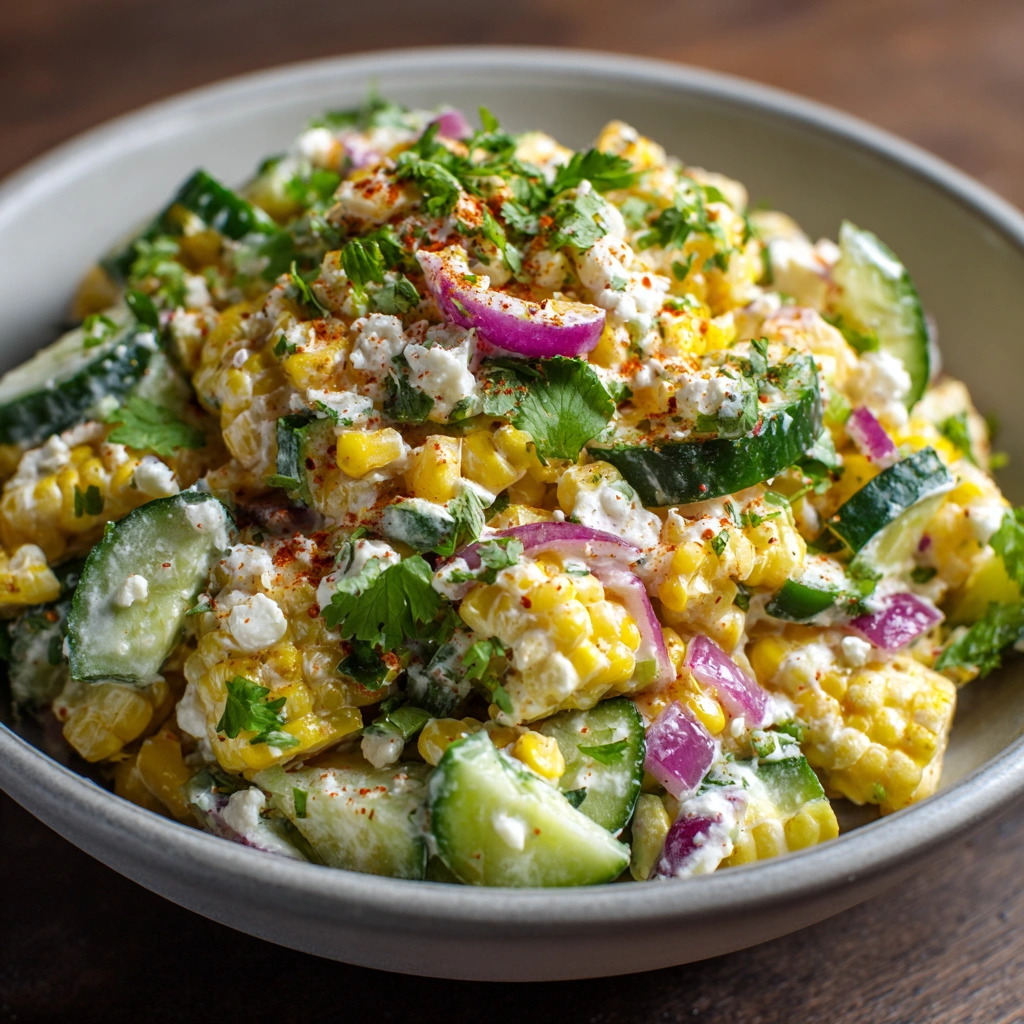A refreshing, creamy salad with sweet corn, crisp cucumbers, and tangy, flavorful dressing. Perfect as a side dish for summer cookouts, weeknight dinners, or potlucks.
