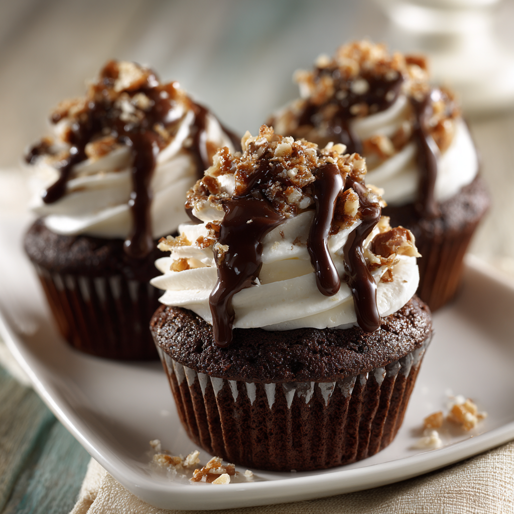 Moist chocolate cupcakes topped with fluffy whipped cream, rich chocolate sauce, and crunchy toffee bits for the ultimate indulgence.