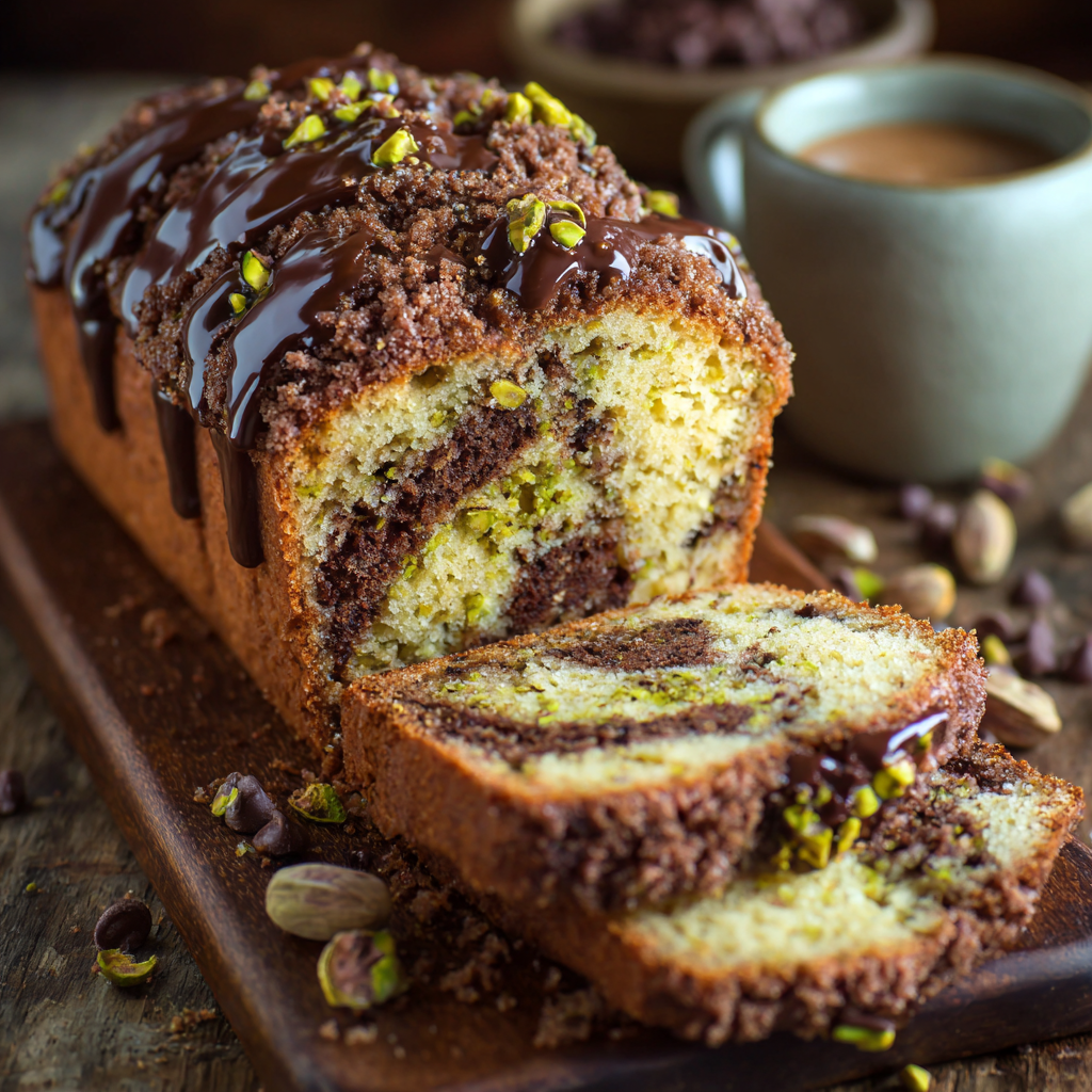 This Triple Chocolate Pistachio Bread is a soft, dessert-style loaf that combines the nutty flavor of pistachios with three kinds of chocolate — in the batter, in a streusel layer, and as a silky ganache on top.